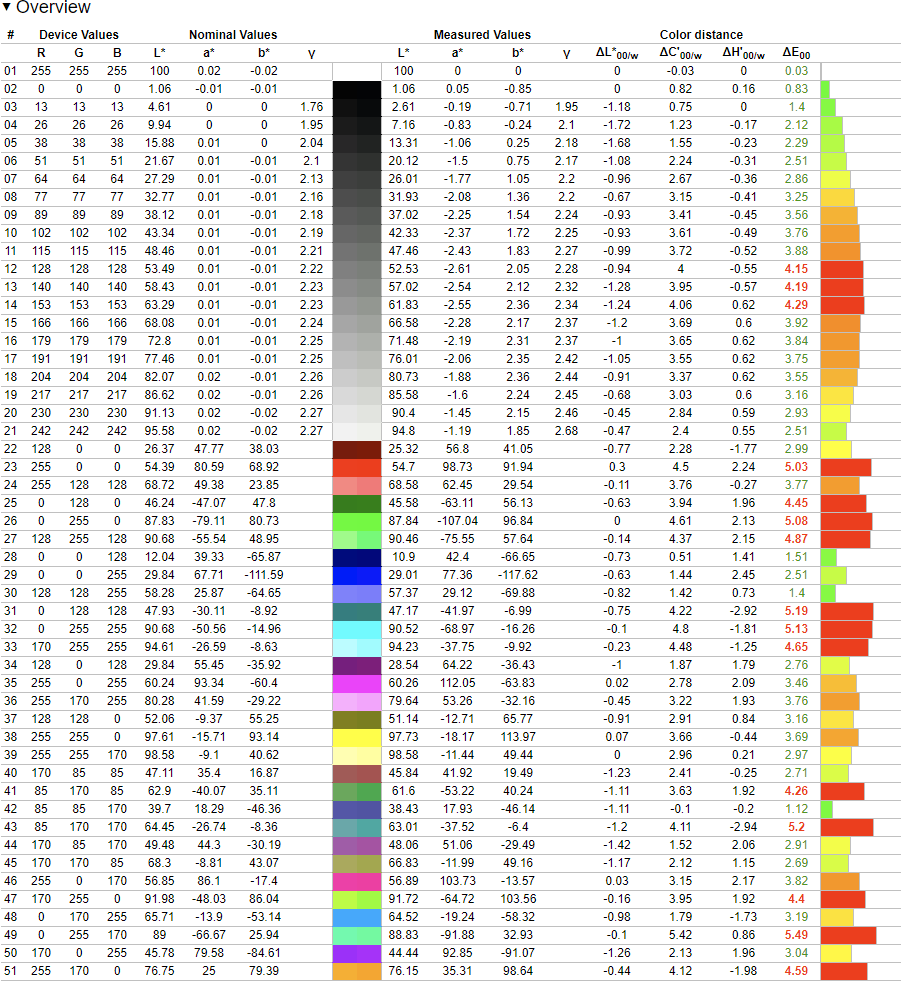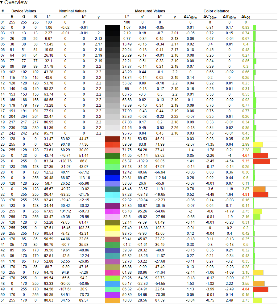 Measuring this profile against several color spaces gives the folowing results. Note that Adobe RGB has several high dE spikes since the monitor is technically not able to display the full saturation targets of Adobe RGB.